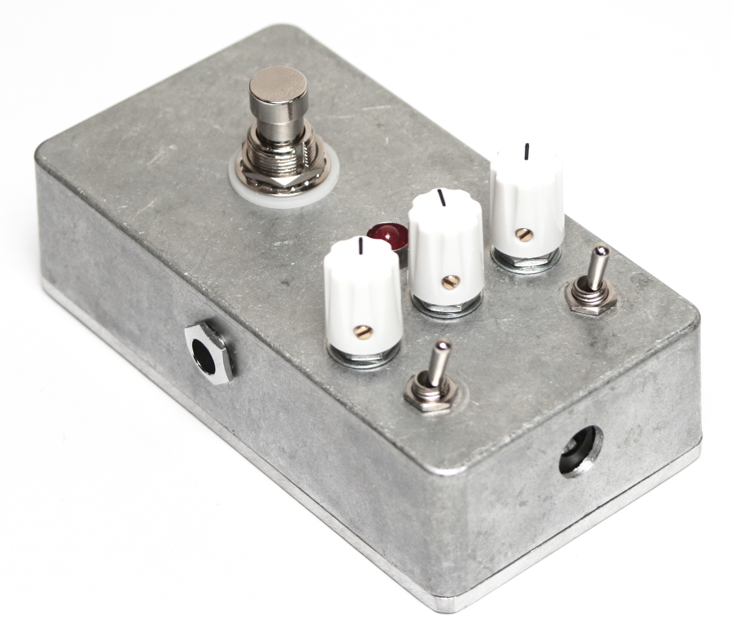 Now we are going to populate all the controls for the pedal, including the 3pdt stomp switch, the potentiometers and the LED. Make sure you populate everything according to the BOM, and take care with the LED. It is polarized, so make sure that you align the flat side of the LED with the same indicated flat side on the silkscreen. When placing the 3pdt stomp switch, it should only fit one way, but make sure that the two flat sides of the base are facing the front and back of the boards.